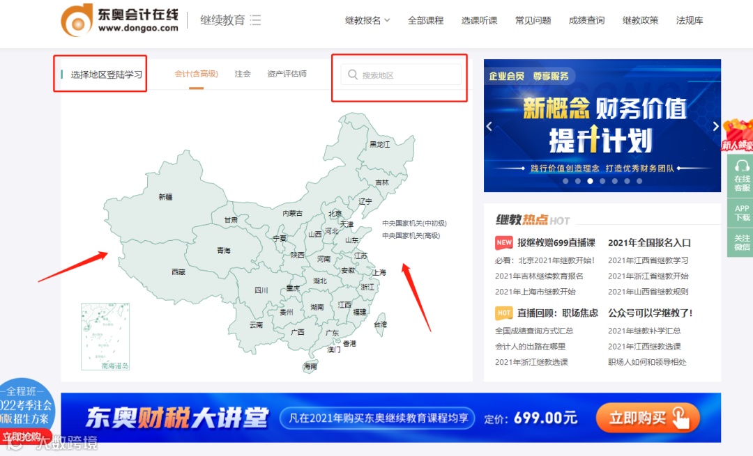 在上文中小奥也提到了,各地有其继教规则,所以开通时间,学习入口也不尽相同,学员如想知道自己所属地区是否已开通继续教育可登录东奥继教官网查询,而想参加会计继续教育的学习,请登录东奥继续教育网址,即https://www.dongao.com/jxjy/,下方有一个中国地图,选择所在地区进入学习。