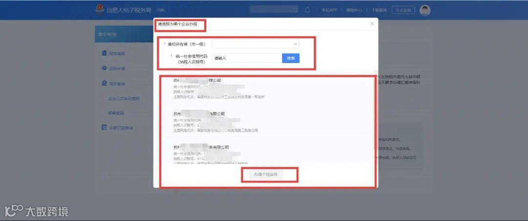 若您所使用的个税APP扫码人员是公司的法定代表人或财务负责人的,则下面会直接显示对应企业的名称和税号,您点击选择即可,然后点击“办理个税业务按钮”