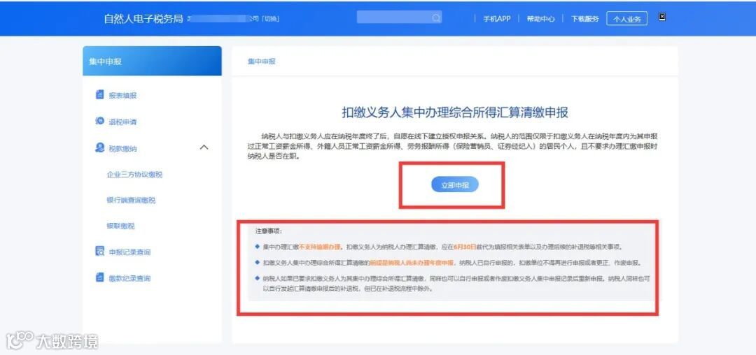 注意事项:集中办理汇缴不支持逾期办理。扣缴义务人为纳税人办理汇算清缴,应在6月30日前代为填报相关表单以及办理后续的补退税等相关事项。