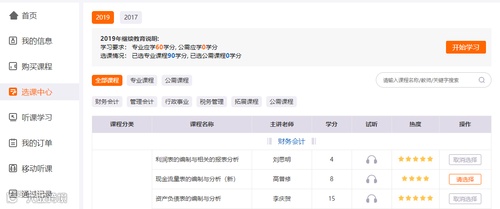 选课流程:由于学员已经在吉林会计网交完费,现在直接选课即可。如图所示:课程后面相应会有“请选择”字样,选择的课程若是不想选了,可点击“取消选择”字样。