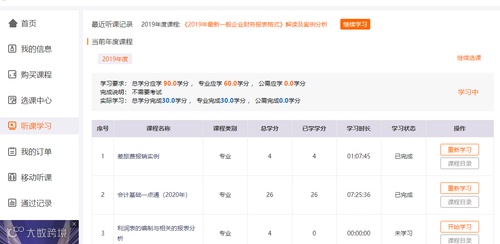 听课流程:选择左侧导航栏处听课学习,会出现所选的所有课程,如图所示:若学员还未开始学习时,课程后面彩色字样是“开始学习”;若是一节课程没学完,会显示“继续学习”字样;若是一节课程完全学习完成,相应后面会显示“重新学习”字样,望学员周知。