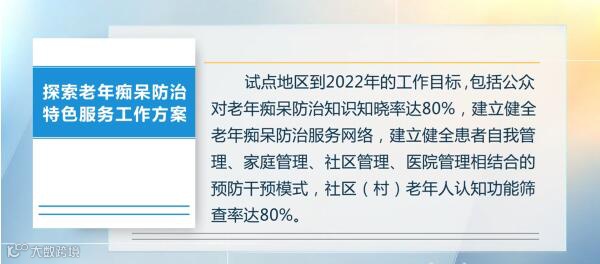 《明日之子》中,徐佳莹和张洢豪唱了一首《寻人启事》,徐佳莹说,歌词是来源于老年痴呆,患者想要在记忆中找到自己心里所想的那个人,但是触摸不到。他们是走进了记忆沼泽的人。他们忘记了该如何生活,忘记了如何为人处世,却一直在爱着脑海中里的那个人。实际上,国家也很重视预防阿尔茨海默病早发现、早干预的重要性。今年9月11号,国家卫生健康委办公厅发布了《探索老年痴呆防治特色服务工作方案》,指出要开展患者评估筛查和预防干预服务,并提出试点地区到 2022 年的工作目标,即包括公众对老年痴呆防治知识知晓率达80%,社区老年人认知功能筛查率达80%。