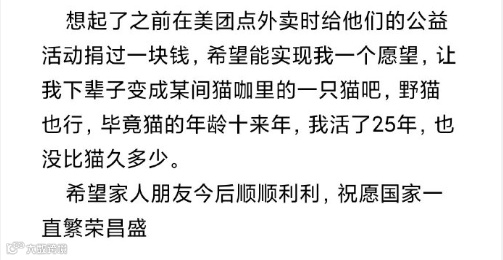 他在微博留下了一封很长的信,信中讲述了从论文、实验、毕业、考试等方面遇到的一系列问题,信的结尾,他说“希望来世能做一只猫,希望家人朋友顺利,国家繁荣昌盛”,连结束,都没有过歇斯底里,他应该是一个温柔的男孩子吧。