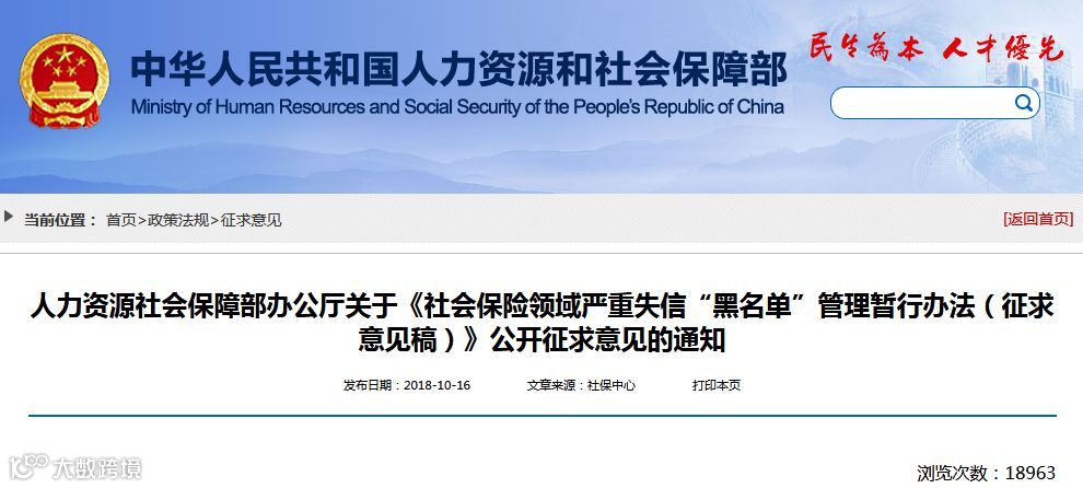 人社部日前制定了《社会保险领域严重失信“黑名单管理暂行办法(征求意见稿)》,向社会公开征求意见。