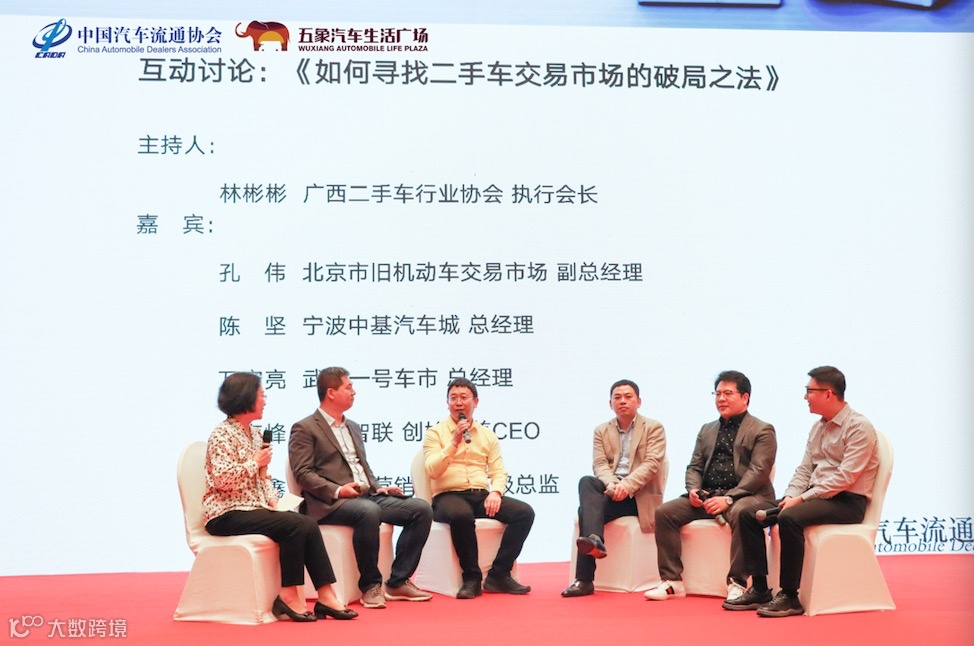 在互动环节,由广西二手车行业协会执行会长林彬彬主持,北京市旧机动车交易市场副总经理孔伟,宁波中基汽车城董事长陈坚,武汉一号车市总经理万宏亮,信车智联创始人兼CEO柴海峰、查博士营销中心高级总监边鑫参与,围绕如何寻找二手车交易市场的破局之路展开精彩的讨论。
