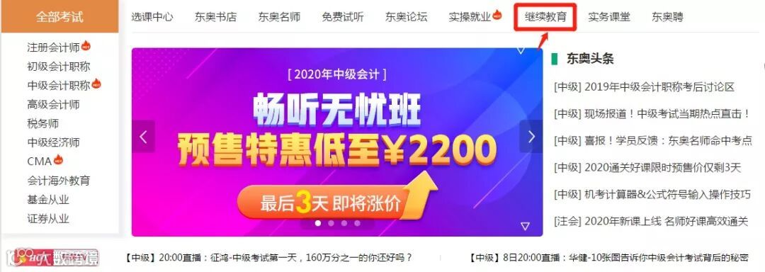 学员首先需登录东奥会计在线官网首页,点击头部导航栏“继续教育”。