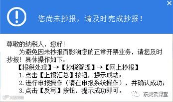 2、启动开票软件时增加“未抄报提醒”:每月15日之前(包括15日),启动开票软件,会自动监测征期抄报情况,若监测到征期未抄报,如下图提示用户进行抄报税。