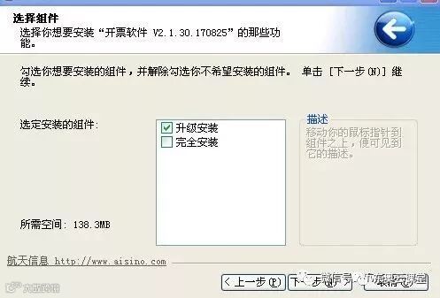 出现这个提示以后,默认的就是“升级安装”,直接点下一步,直到完成即可!千万不要选择“完全安装”,否则开票数据有可能会丢失!