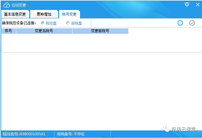 4、在线变更:点击"系统设置-税控设备设置-税控设备在线变更”,实现纳税人识别号、纳税人名称、税务机关代码(离线控制信息)变更内容在线远程写入税控设备。