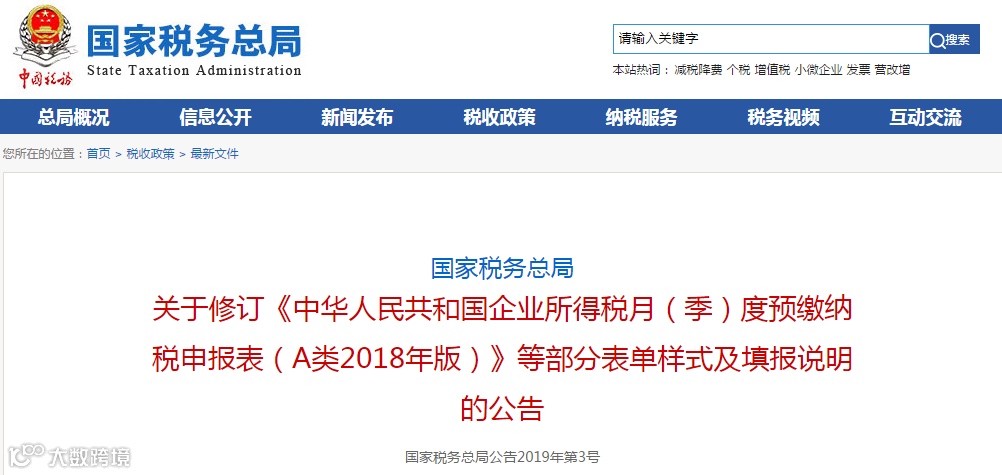 对《中华人民共和国企业所得税月(季)度预缴纳税申报表(A类,2018年版)》《中华人民共和国企业所得税月(季)度预缴和年度纳税申报表(B类,2018年版)》和《中华人民共和国企业所得税年度纳税申报表(A类,2017年版)部分表单和填报说明进行了修订。