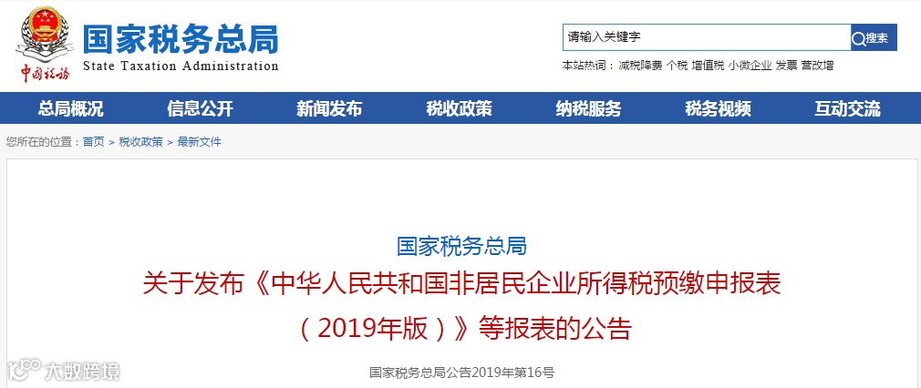 自办理2019年度第一季度企业所得税预缴申报起启用《中华人民共和国非居民企业所得税预缴申报表(2019年版)》;