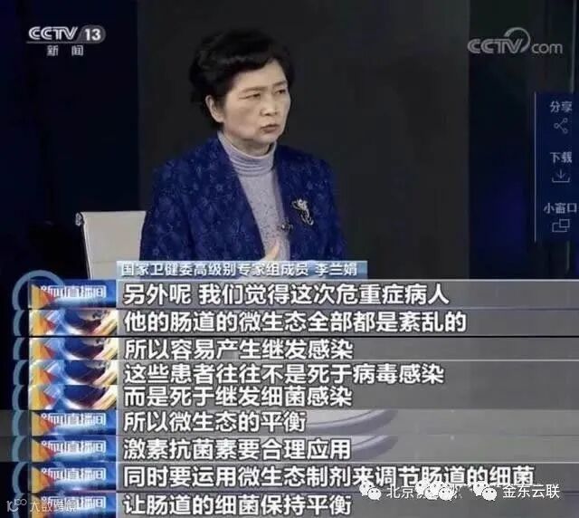 李兰娟院士指出在临床治疗中发现,大部分危重症患者的肠道微生态是紊乱的。肠道的免疫屏障作用减弱,肠道内寄居的有害菌更容易进入体内导致继发细菌感染,增加死亡率。而使用抗生素治疗周期长,可能会导致真菌感染或加重肠道微生态紊乱形成恶性循环。在《新型冠状病毒感染的肺炎诊疗方案(试行第五版)》指出“可使用肠道微生态调节剂,维持肠道微生态平衡,预防继发细菌感染”。