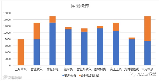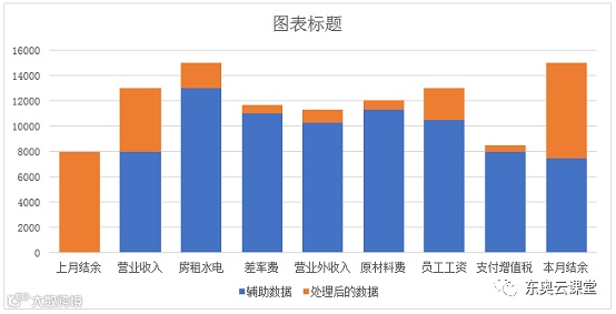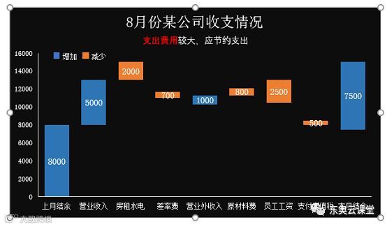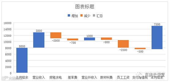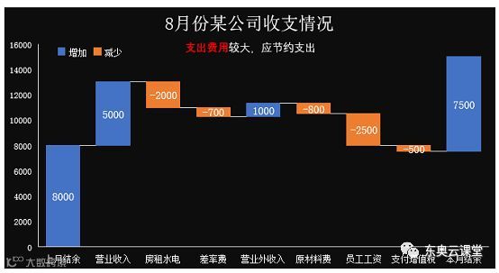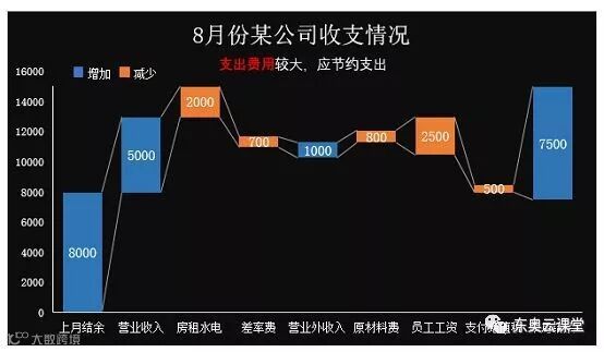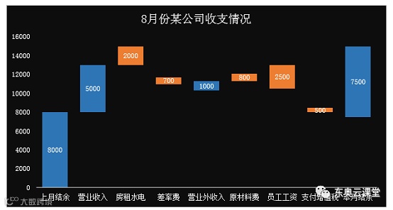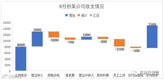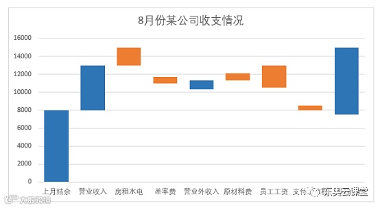 今天跟大家分享的是分别通过堆积图和瀑布图制作公司月度收支图表。最终效果如下所示:
