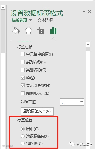 选中数据标签后右击选择【设置数据系列格式】,标签位置选择居中。