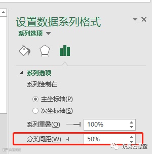 选中柱状图后右击选择【设置数据系列格式】。打开【设置数据系列格式】对话框,将分类间隔设置为50%。