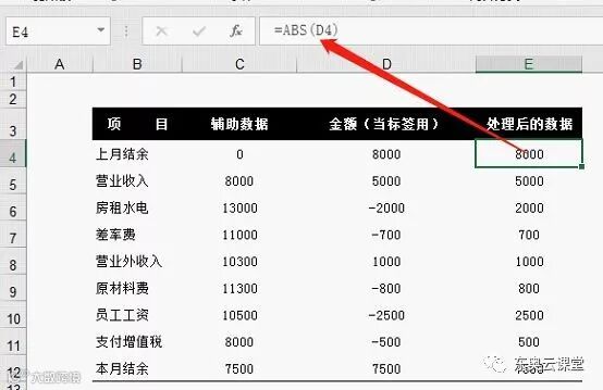 在E4单元格输入公式:=ABS(D4),双击填充柄向下填充公式。
