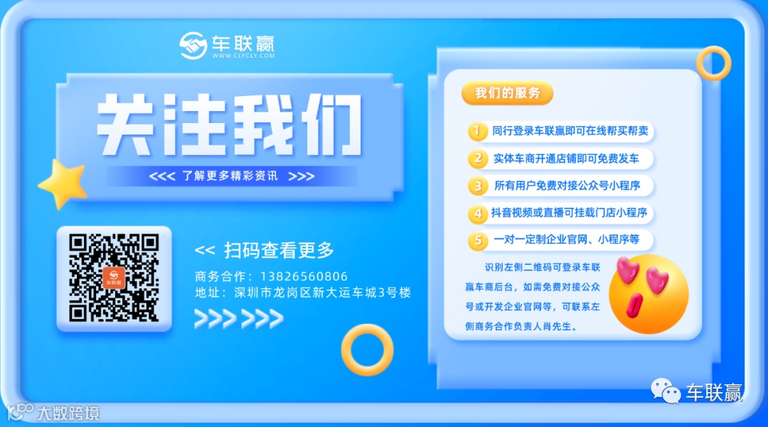 汽车有型市场是广大车商和车源的集散中心,也是建立汽车综合服务的运营中心、二手车零售展示,批发处理,物流运输,评估检测、维修整备,售后保养、保险金融、牌证办理、汽车精品等,以及延伸网络开展的异业配套服务中心,系统工具我们最具性价比,专业输出,持续改进。车联赢基于自身专业的行业经验积累及团队自身技术优势,了解行业,了解需求,也希望与有想法的市场协会单位,开展强强联合、互惠合作,促进行业资源优势互补,诚邀您的参与,资源共享,合作共赢!