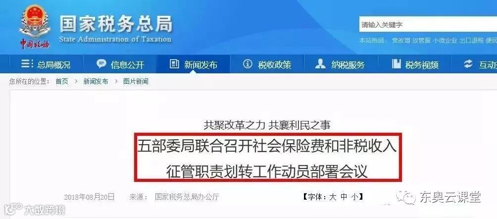 根据之前国家税务总局、财政部、人力资源和社会保障部、国家卫生健康委员会、国家医疗保障局视频会议部署,今年12月10日前要完成社会保险费和第一批非税收入征管职责划转交接工作,自2019年1月1日起由税务部门统一征收各项社会保险费和先行划转的非税收入。