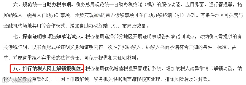 八、推行纳税人网上解锁报税盘。税务总局优化增值税发票管理新系统,增加纳税人端异常清卡解锁功能,纳税人报税盘异常锁死时,可网上申请解锁,税务机关根据规定流程核实处理,排除风险后及时解锁。