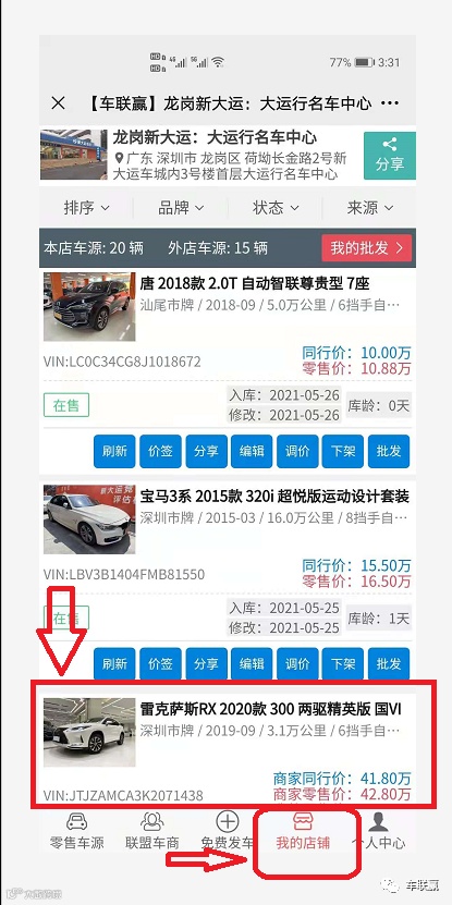 3)因为任何车辆首页都直接有店铺名,车行位置,虽然有直接电话,但很多同行都愿意直接联系老板,感觉这样车况能了解准确,价格也好谈,当同行找车时在上面看到店铺名是熟悉同行的,可能就直接联系老板了,也不会在线打电话,就导致发车的人没电话,接电话的老板也不知道是车联赢看到的信息,你说有没效果呢,有没这种可能呢(建议车行老板安排专人负责更新跟进,自己也可同步管理本店车源,了解行情)!