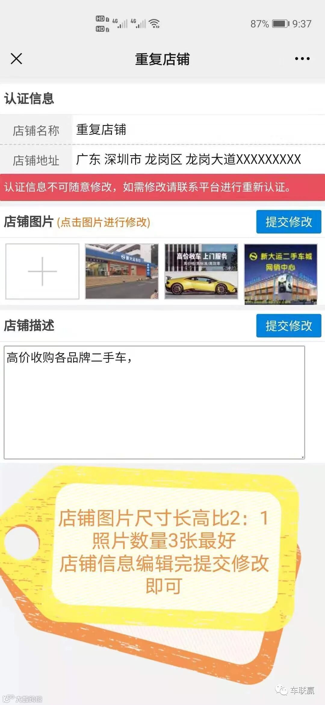 所有二手车商都可在线申请免费店铺,免费开店,免费发车,不需任何会员费,店铺地址要填写详细,审核后不能随意更改的,修改店铺名和地址要联系后台客服的,可加客服微信:13725513036(微信同号),店铺照片和个人名称可以随意更改,便于同行联系及提升店铺形象使用,