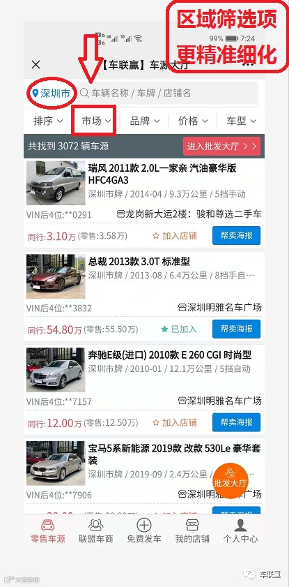 当你验证登陆车源大厅首页后,可点击左上角“”全国“”按钮(如图标深圳位置),筛选城市,选择你所在的城市后,下次登陆会直接默认保存的,点击“市场”按钮可进地区市场筛选,可根据您就近的区域选择单个市场,也可选择地区总库,直接查看对应细分区域车源信息了,二手车行业,就近合作才更靠谱,就近找车合作才更容易,毕竟二手车这东西还是要看下车况才能确定成交,就近合作,同行也才能更信任!当然也可以通过品牌,价格,车型等按钮,进行精准筛选找车.