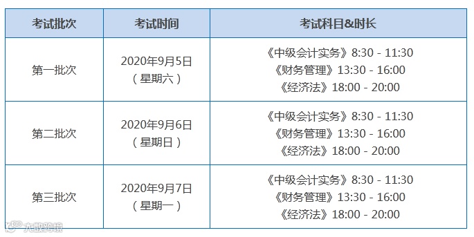 2020年中级会计考试时间定于9月5日-9月7日,共分三个批次进行,各科目时间安排如下: