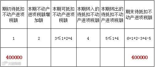 1、2019年3月税款所属期,该纳税人《增值税纳税申报表附列资料(五)》第6栏“期末待抵扣不动产进项税额”的期末余额为400000元。见下图: