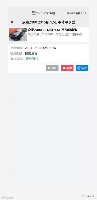 2:第三方检测的对应车辆微信端分享展示将有认证标识,但不会显示报告详情,可提升客户来电/店购车意向,且第三方检测兜底车况,买车卖车更放心.