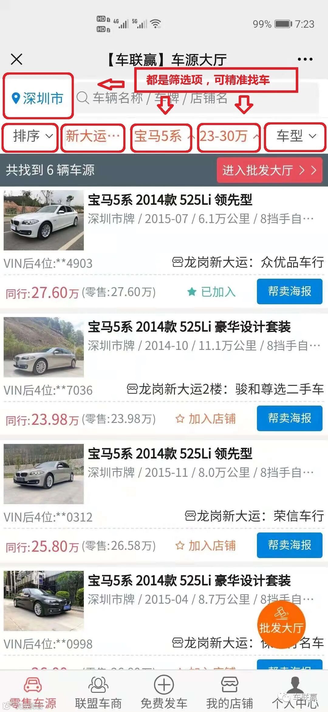4)所有车源都是一手展示,发布车源30秒1台搞定,每天大量同行在线找车,查行情,作对比,便于您与周边同行库存共享,管理自家车源的工具,至于效果,还真要看你有多了解我们了,每天几百台都是同行自己发布的哦!