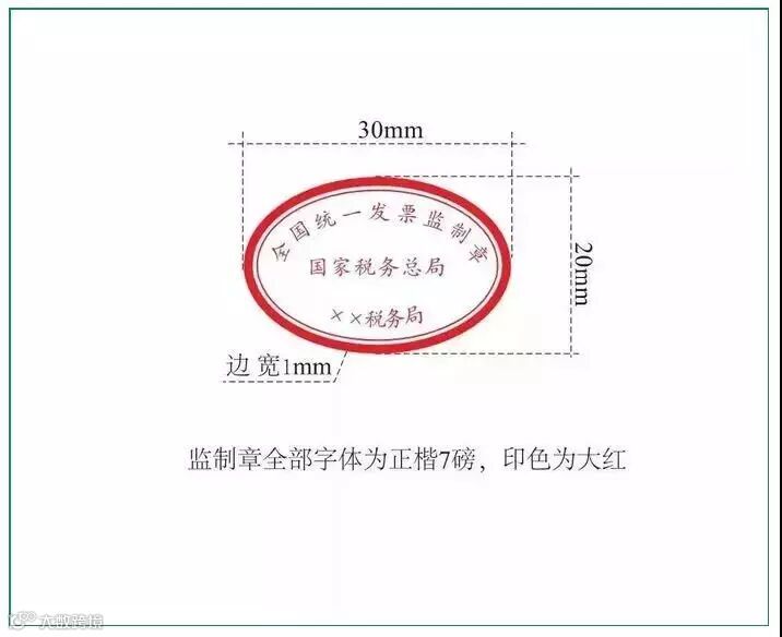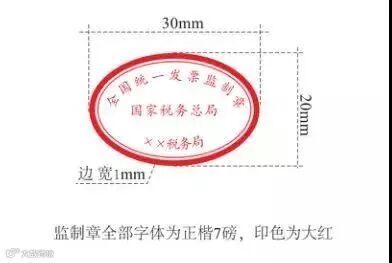 2.发票板式:形状为椭圆型,长轴为3厘米,短轴为2厘米,边宽为0.1厘米,内环加刻一细线,上环刻制“全国统一发票监制章”字样,中间刻制“国家税务总局”字样,下环刻制“××省(区、市)税务局”字样,下环字样例如:“江苏省税务局”、“上海市税务局”、“内蒙古自治区税务局”、“新疆维吾尔自治区税务局”。字体为楷体7磅,印色为大红色。