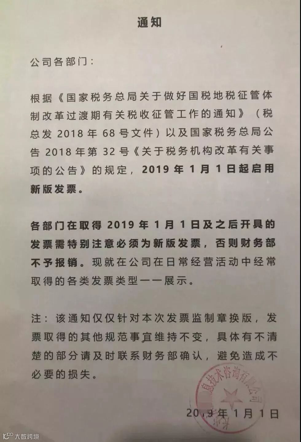 这几天,很多公司都已经下发了2019年发票报销新规通知(如下图所示),明确了1月1日开具的发票必须为新版发票,否则不予报销!