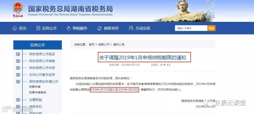 为适应纳税人办理纳税申报的实际需求,经我局研究决定,实行每月或者每季度期满后15日内申报纳税的各税种,2019年1月申报纳税截止期限由2019年1月15日延长至2019年1月18日。