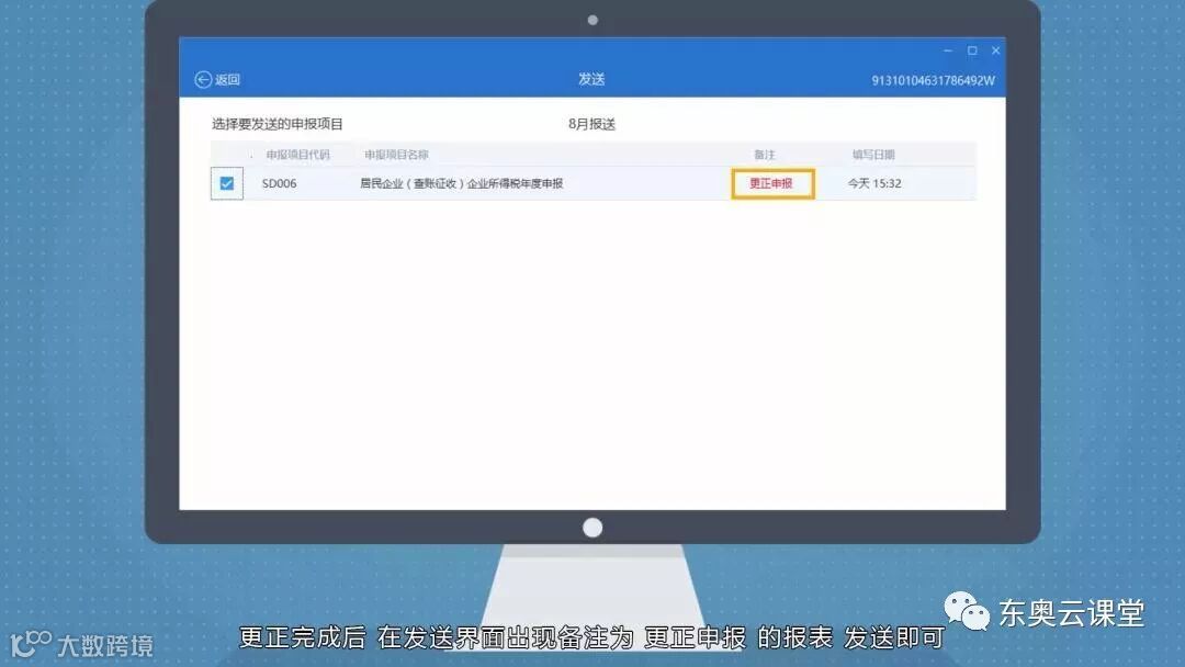更正完成后,在发送界面出现备注为“更正申报”的报表,发送即可。在申报界面查看更正申报结果。