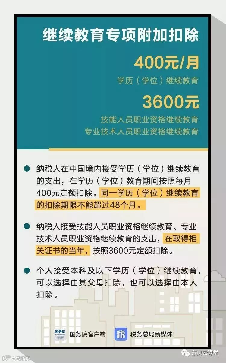 此外,审计专业资格、资产评估师、经济专业技术资格、证券从业资格、法律资格证书、教师资格证等都被纳入到3600元的继续教育扣除范围内。也就是说,如果你今年拿到以上所提到的证书,就可以申请3600元的专项扣除。