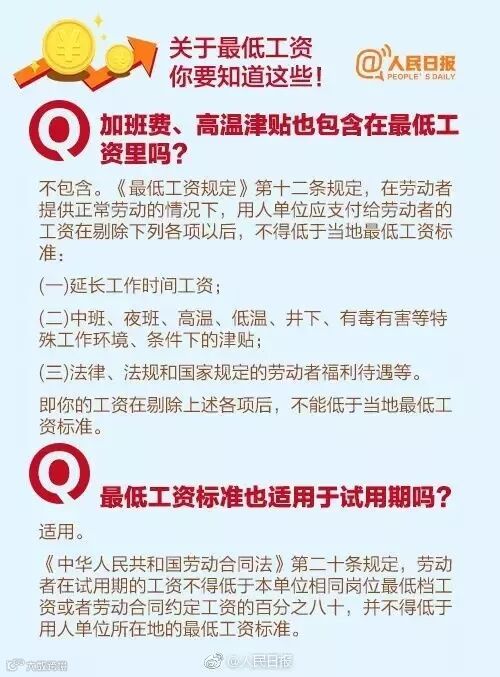 注意!最低工资标准不包括这些 :加班加点的工资;中班、夜班、高温、低温、井下、有毒有害等特殊工作环境、条件下的津贴;法律、法规和国家规定的劳动者福利待遇等。
