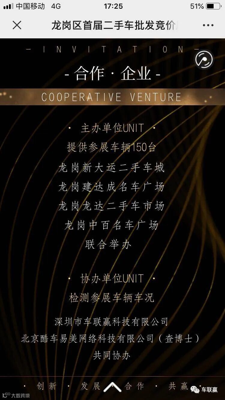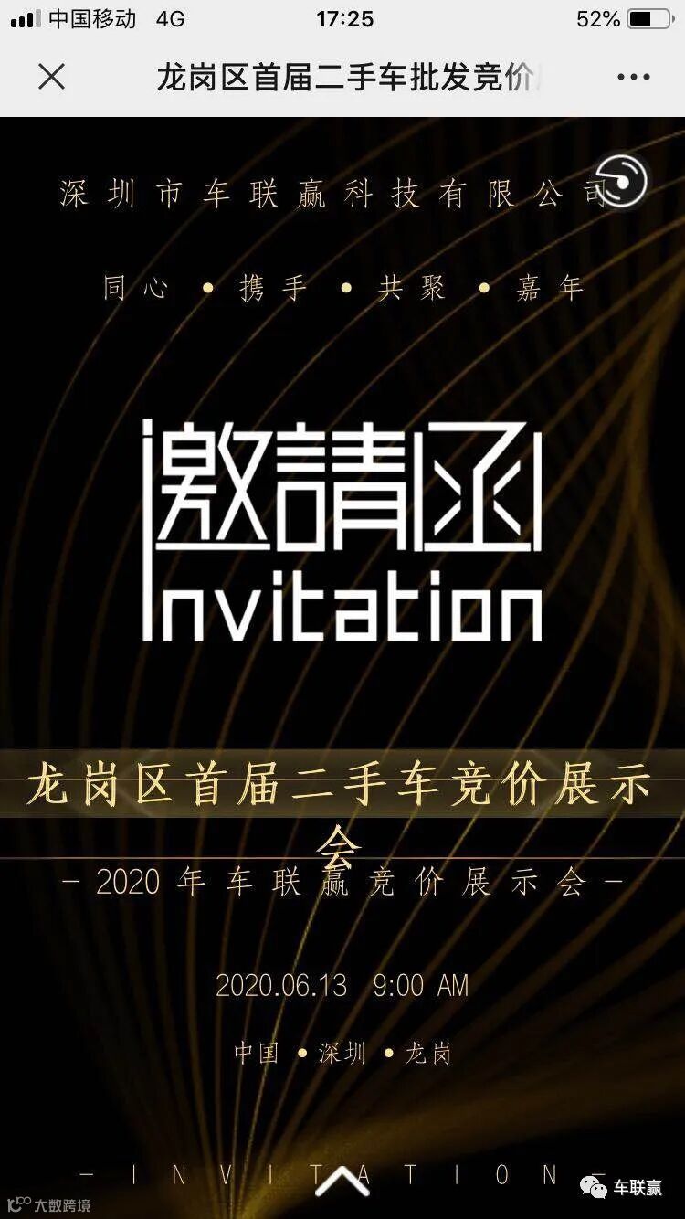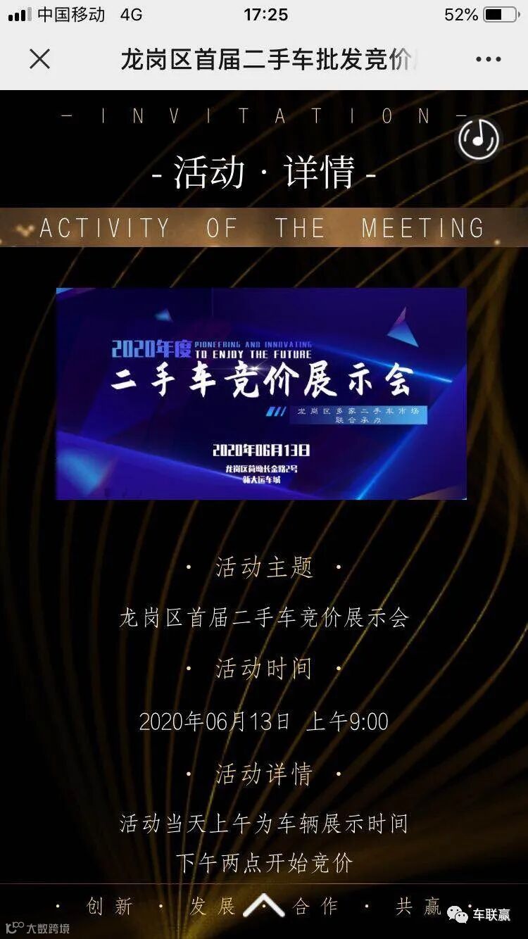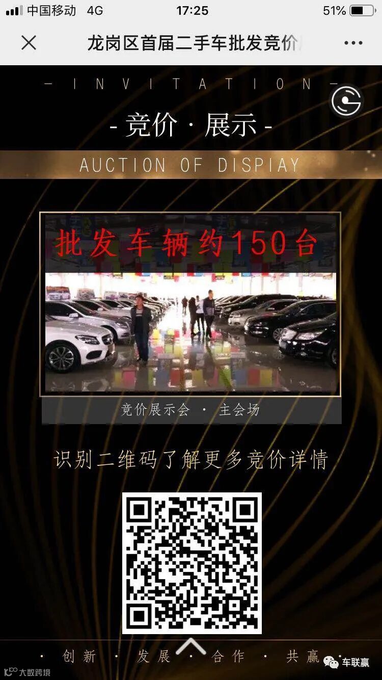 热烈祝贺龙岗区首届二手车批发集中展示会,将于6月13日星期六举办,专场竞价区线上展示