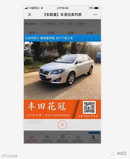 直接点击任意车辆,分享,蓝色按钮,即可自动1秒生成分享图片,图片显示分享人电话及对应链接二维码:进行朋友圈及微信转发:客户可通过识别二维码看到详细信息。电话自动变为分享人的联系方式,进分享人的店铺: