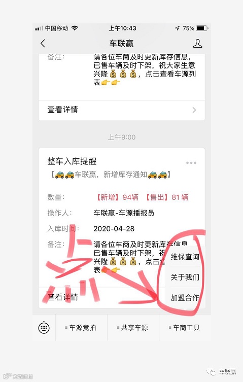 第一步:关注车联赢公众号:点击维保查询