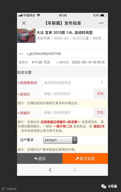 2)是否需要第三方检测,由卖方及发布单位自行商议确定,经由第三方检测,检测报告将同步展示在竞价车源信息展示中,利于外地车商在线竞买,及促进成交,拉高成交价,第三方检测单位:查博士;