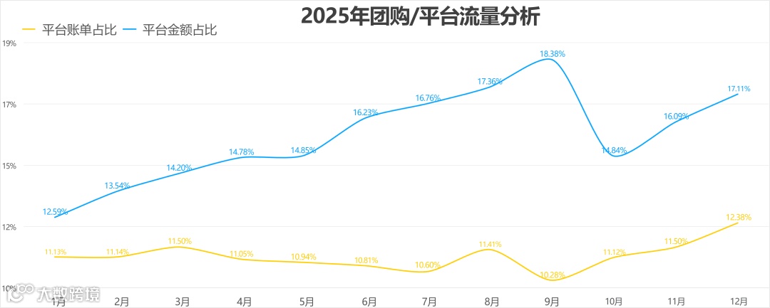 团购:平台引流从 “拉新” 转向 “促高消费”,2025 年金额占比从 1 月 12.59% 升至 9 月 18.38%,账单占比稳定在 10%-12%,多人消费套餐成为平台引流核心。