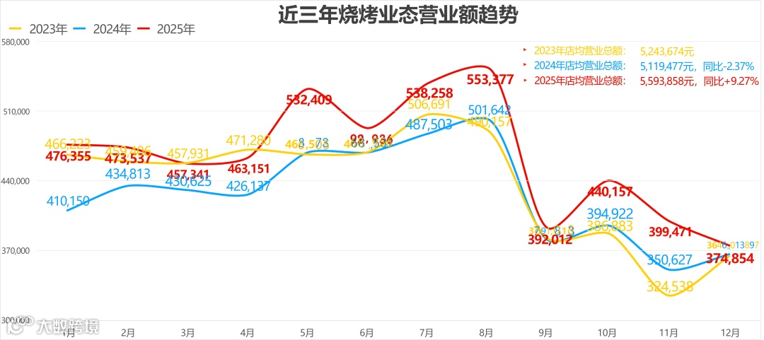 增长逻辑:精准捕捉 “夜间社交” 场景需求,产品覆盖烤串、炒菜、汤锅等,适配多人聚会;季节驱动明显,7-8 月为消费高峰(2025 年 8 月店月均营业额 55 万+),淡季营业额较前两年也明显增长;