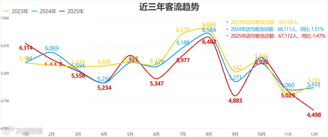 客流:全年店均客流 6.71 万人次,同比 2024 年下降 1.47%,7-8 月为客流旺季(2025 年 8 月店月均 6482 人),12 月跌至 4498 人(三年同期最低);