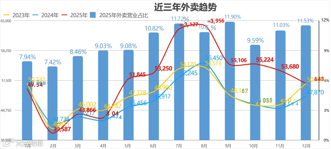 外卖:2025 年外卖营业额同比增长超 20%,7-9 月占比突破 11%,线上化渗透加速;消费场景高度绑定季节,2 月占比最低(7.6%),7-9 月占比最高(超 11%);