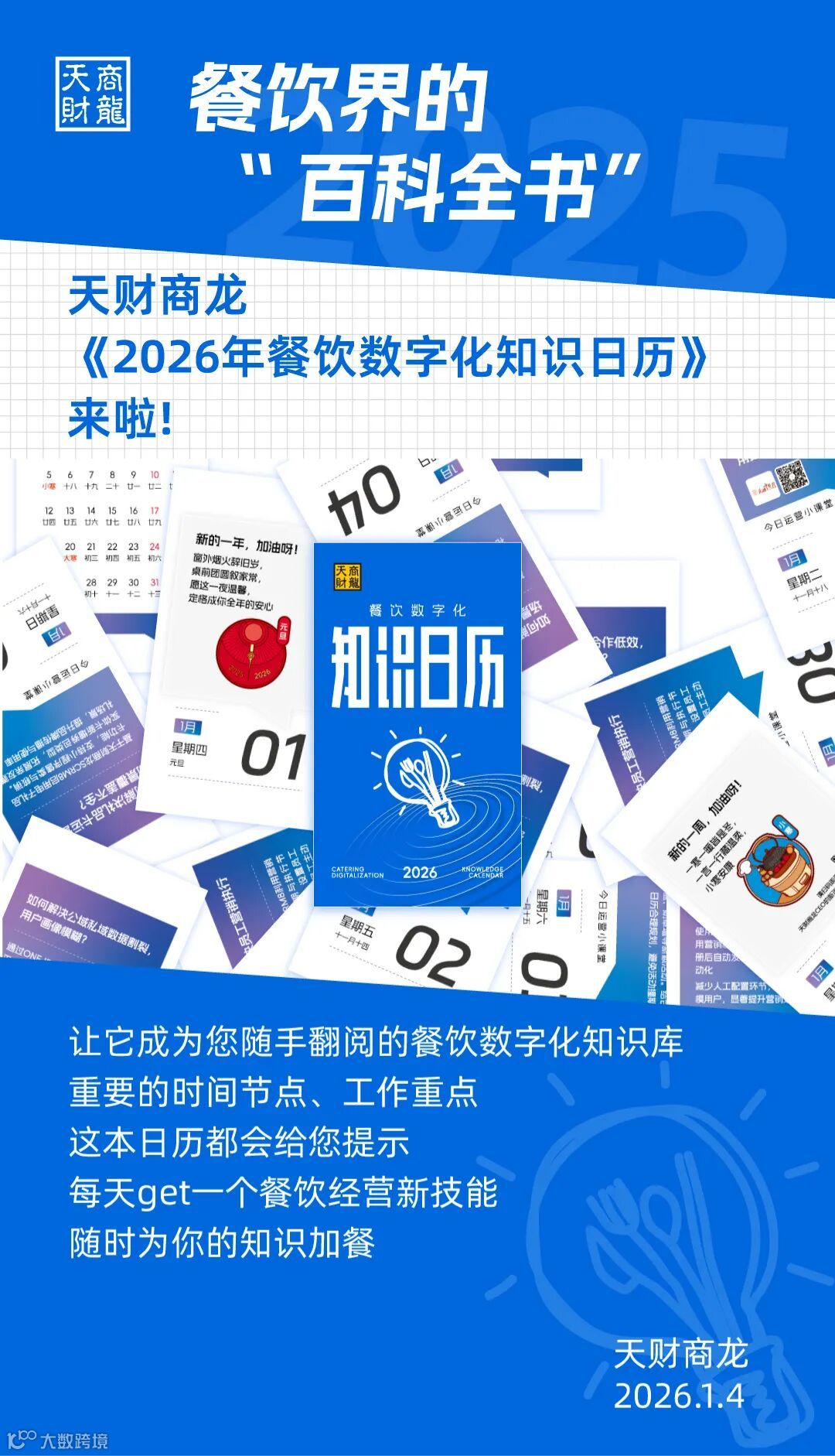 前 10 名餐饮品牌留资即可免费领取《2026 天财商龙餐饮数字化知识日历》!