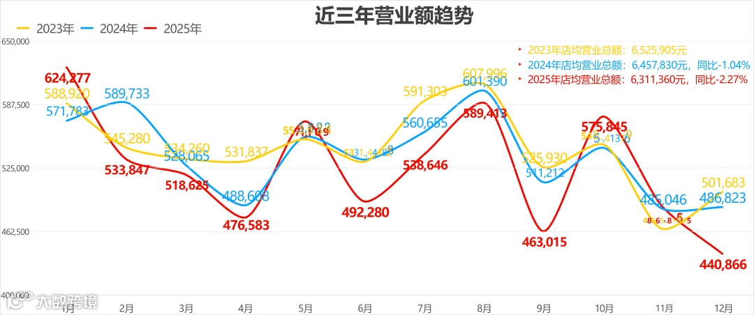 店均年营业额三年连降:2023 年 652.6 万→2024 年 645.8 万→2025 年 631.1 万,同比 2024 年下降 2.27%,消费收缩 + 门店过剩导致 “增量难寻”;