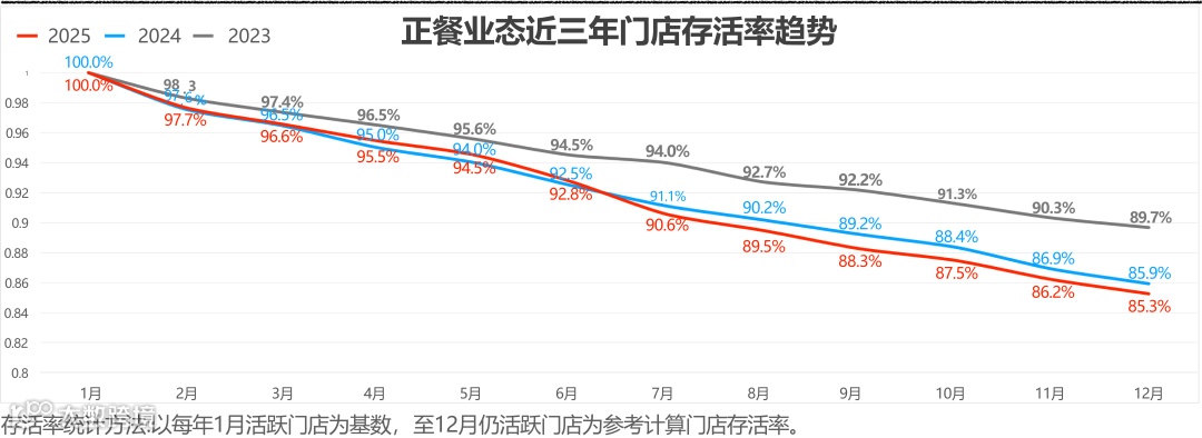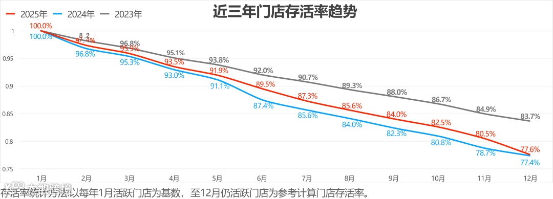 全年整体存活率 77.6%(较 2024 年 77.3% 提升 0.2 个百分点),优质连锁品牌抗风险能力凸显,单店淘汰率持续走高;