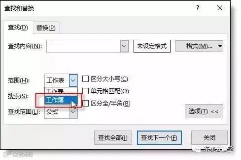 默认情况下,查找窗口中只是在当前的工作表中查找,如果要所有工作表中查找,就把查找范围修改为“工作簿”