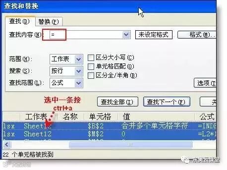 选取工作表中所有的公式,别以为只有定位功能可以实现。在查找窗口中输入 = 号,点击“查找全部”,然后再按ctrl+a即可选取表中所有公式。
