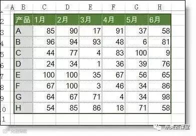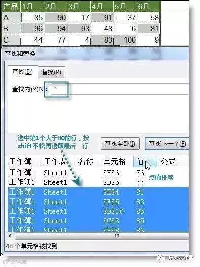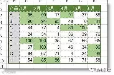 【例】如下图所示表中,要求选取1~6月各产品销量数量>80的单元格,并填充绿色背景。